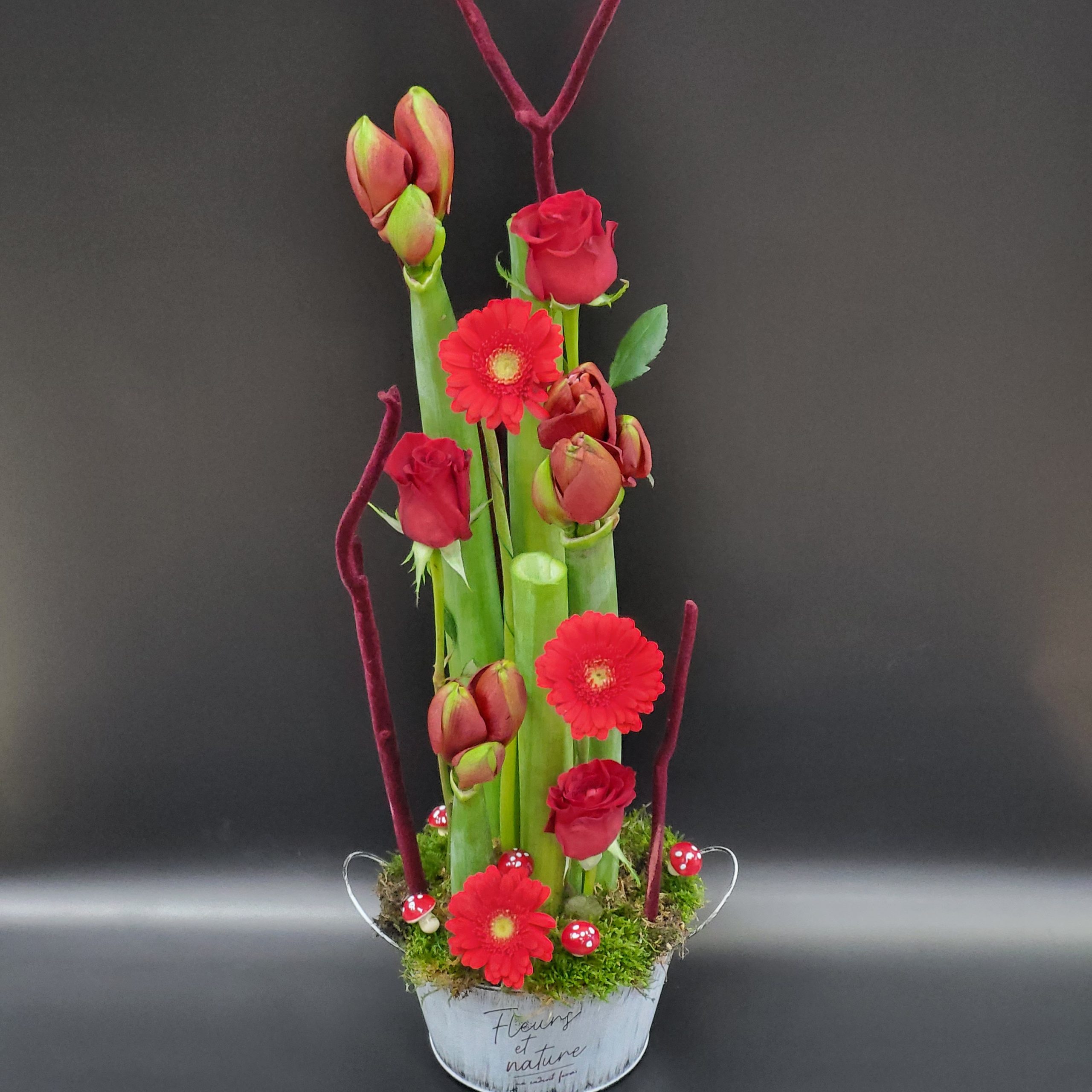 • DESCRIPTION : C’est une composition de fleurs diverses de couleur rouge en hauteur pour un effet élégant et apporter de la lumière. Facile d’entretien.