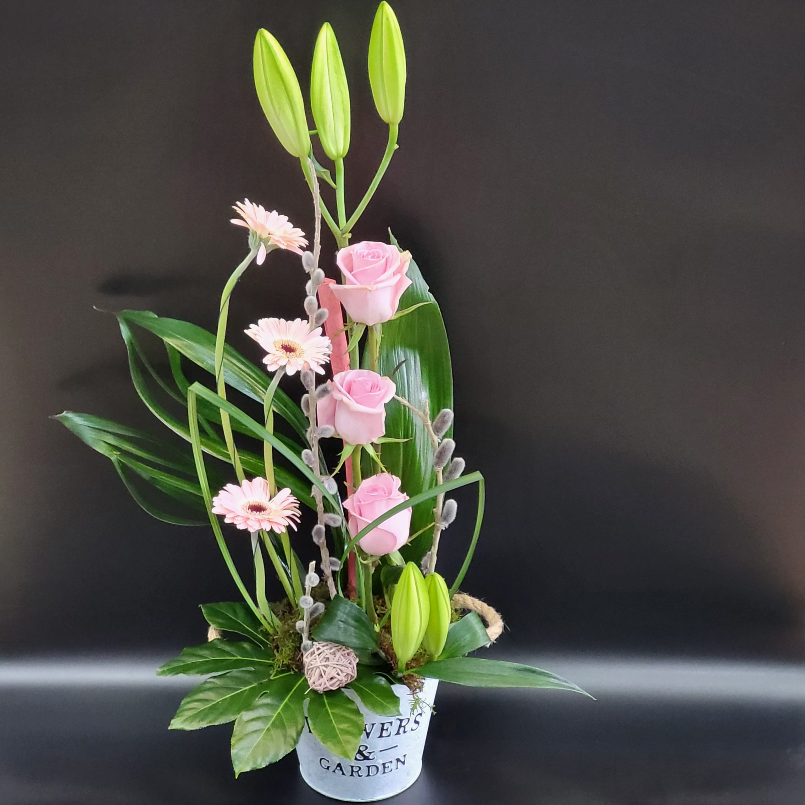 • DESCRIPTION : C’est une composition de fleurs diverses dans les tons roses, en hauteur pour un effet élégan. Facile d’entretien